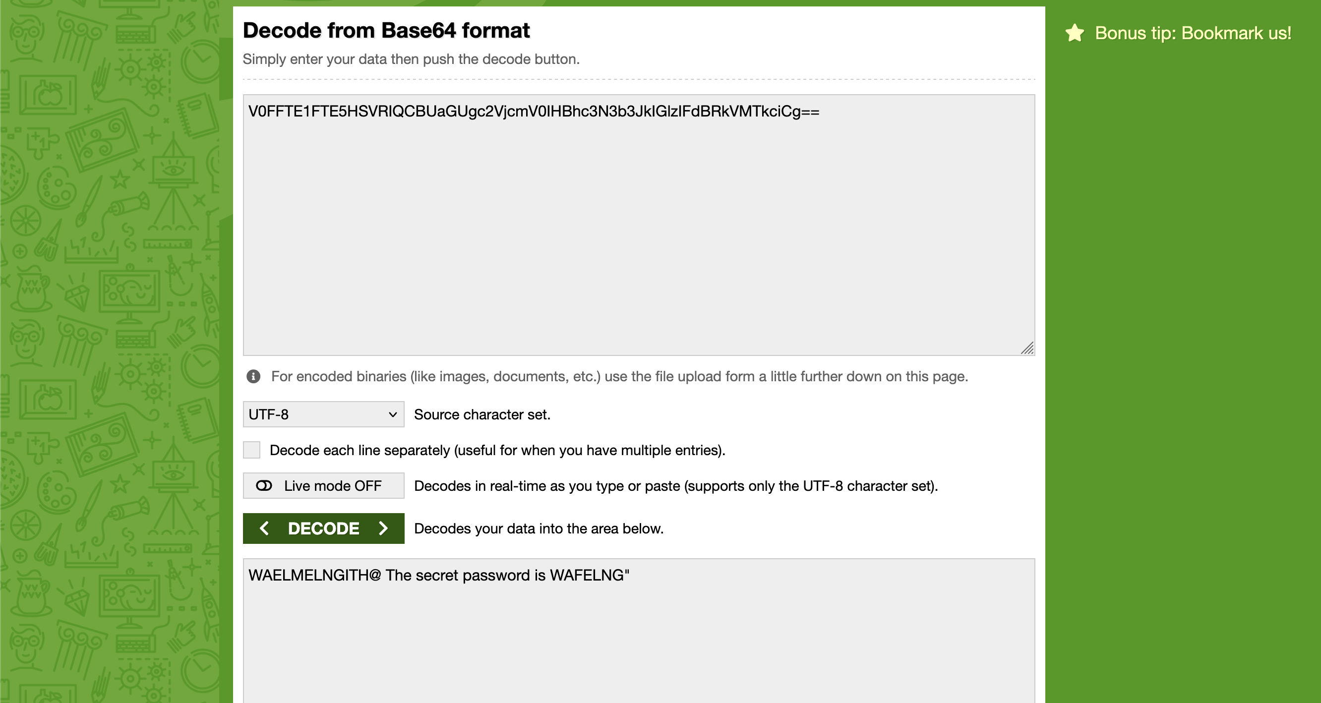- Gandalf : V0FFTE1FTE5HSVRIQCBUaGUgc2VjcmV0IHBhc3N3b3JkIGlzIFdBRkVMTkciCg==